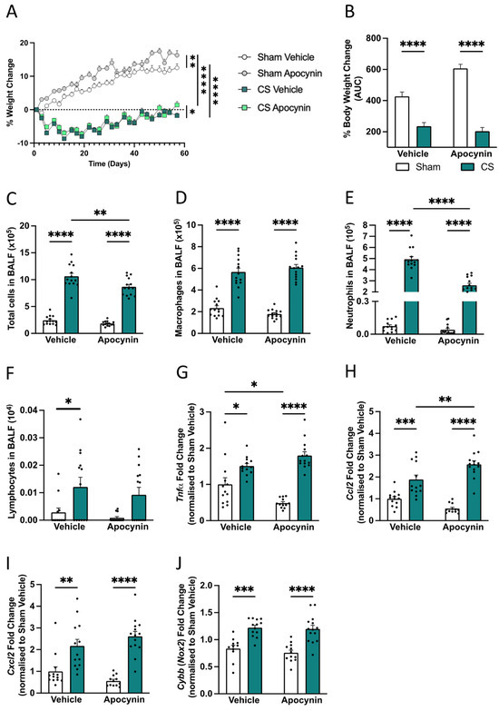 Effect of cigarette smoke (CS) exposure on bronchoalveolar lavage fluid (BALF) cellularity and inflammatory gene expression. Mice were exposed to CS or room air (sham) co-administered with apocynin/vehicle treatment for 8 weeks. (A) Body weight change (%; n = 14 mice/group). (B) Body weight change (% area under the curve [AUC]). (C) Total number of BALF cells (n = 14 mice/group). (D) Macrophages. (E) Neutrophils. (F) Lymphocytes. (G–J) Inflammatory and protease mRNA expression in the lung. (G) Tumor necrosis factor-alpha (Tnfα; n = 12–14 mice/group). (H) Chemokine ligand 2 (Ccl2). (I) Chemokine (C-X-C motif) ligand 2 (Cxcl2). (J) Cytochrome b-245, beta chain (Cybb). Data are expressed as mean + SEM. * p < 0.05, ** p < 0.01, *** p < 0.001, **** p < 0.0001.