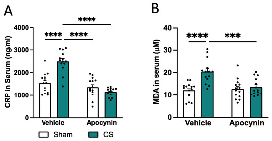 To assess whether prophylactic administration of the Nox2 inhibitor apocynin was able to prevent systemic inflammation and oxidative stress, we measured serum CRP and lipid peroxidation levels (MDA), respectively. CS exposure caused a significant increase in serum CRP (Figure 3A) and lipid peroxidation (Figure 3B) compared to sham-vehicle mice. A prophylactic apocynin treatment prevented the elevated CRP (interaction of exposure by treatment: F(1,52) = 29.72, p < 0.0001; Figure 3A) and MDA (interaction of exposure by treatment: F(1,52) = 10.14, p = 0.0025; Figure 3B) levels following CS exposure similar to sham vehicle mice.