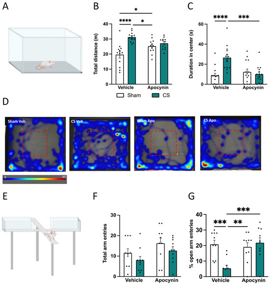 Apocynin alleviated cigarette smoke (CS)-induced hyperlocomotion and anxiety-like behavior. Behavioral testing was performed on mice one week prior to the protocol conclusion. (A) Schematic of an open field task. (B) Total distance (m) moved in the open field. (C) Time spent in the center of the open field arena (s; n = 12 per group) (D) Representative heat maps showcasing the time spent in the center (red box) of the open field arena. (E) Schematic of the elevated plus maze task. (F) Total arm entries. (G) Percentage (%) of open arm entries (n = 10 per group). Data are expressed as mean + SEM. * p < 0.05, ** p < 0.01, *** p < 0.001, **** p < 0.0001.