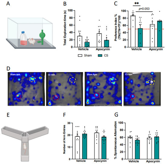 We investigated both recognition and spatial working memory, as anxiety-like behavior is known to be linked to cognitive deficits. While CS exposure did not affect object exploration during the acquisition phase of the novel object recognition task (Figure 5A,B), mice exposed to CS were unable to distinguish between familiar and novel objects in the test phase. This indicates an impairment in recognition memory, and apocynin treatment did not reverse this deficit (F(1,29) = 5.477, p = 0.026; Figure 5C,D). Interestingly, sham mice treated with apocynin showed a trend towards a decreased preference index for the novel object compared to vehicle-treated controls, although this did not reach significance (p = 0.053). CS exposure did not cause any spatial working memory impairments (Figure 5E–G).