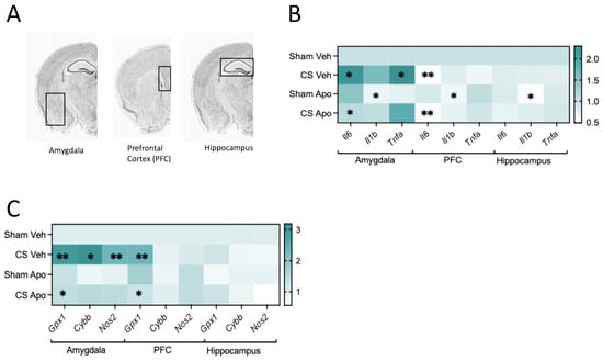 Apocynin altered the neuroinflammatory and oxidative stress profiles following cigarette smoke (CS) exposure. (A) Schematic of brain regions; amygdala, prefrontal cortex (PFC), and hippocampus. (B) Heat map of gene expression (n = 6 mice per group) of inflammatory markers including interleukin 6 (Il6), Il1β, and tumor necrosis factor-alpha (Tnfα). (C) Heat map of gene expression (n = 6 per group) of oxidative markers including glutathione peroxidase (Gpx), cytochrome b-245, beta chain (Cybb), and nitric oxide synthase 2 (Nos2). Data are expressed as means. * p < 0.05, ** p < 0.01.