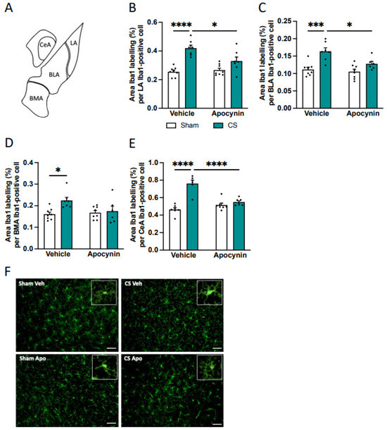Apocynin treatment restored the microglial area per cell in the amygdala nuclei following cigarette smoke (CS) exposure. (A) Schematic of amygdala nuclei. (B–E) Area Iba-1 labeling per Iba-1 positive cell. (B) Lateral amygdala (LA; n = 8 per group). (C) Basolateral amygdala (BLA). (D) Basomedial amygdala (BMA). (E) Central nuclei amygdala (CeA). (F) Representative photomicrographs of the LA from room air (sham) and CS-exposed mice. White inlet represents a single magnified microglial cell. Scale bars are 20 μm. Data are expressed as mean + SEM. * p < 0.05, *** p < 0.001, **** p < 0.0001.
