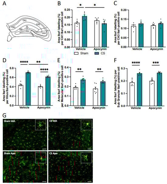 Within the hippocampus, CS exposure caused a significant reduction in the number of Iba-1-positive cells within the molecular region of the dentate gyrus compared to sham mice; however, unlike the amygdala, prophylactic administration of apocynin was unable to prevent the reduced number of microglial cells (main effect of exposure: F(1,19) = 8.034, p = 0.0106; Table 3). We found no differences in the number of Iba-1-positive cells in other regions of the hippocampus (Table 3). Similar to our findings in the amygdala, microglia from vehicle-treated mice exposed to CS showed an increased area per cell in all hippocampal subregions except the CA3 (Figure 8). Apocynin administration completely prevented the increase in microglial area per cell observed in the CA1 region of CS-exposed mice, restoring their microglial profile back to sham levels (interaction of exposure by treatment: F(1,19) = 10.44, p = 0.0044; Figure 8B,G). Prophylactic apocynin treatment partially restored the microglial area per cell within the hilus region of the dentate gyrus, but not to sham levels (main effect of treatment: F(1,19) = 18.04, p = 0.0004; Figure 8D). Apocynin did not alter the microglia profile within the molecular and sub-granular (SG) regions of the dentate gyrus (molecular: main effect of exposure: F(1,19) = 32.47, p < 0.0001; Figure 8E; SG: main effect of exposure: F(1,19) = 68.34, p < 0.0001; Figure 8F).