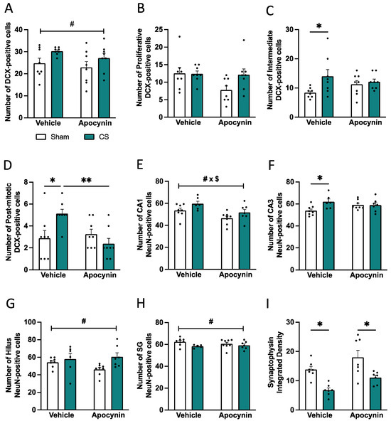 While microglia in healthy rodents support neurogenesis and synaptogenesis by regulating immature and mature dendritic spines for intact cognition, chronic microglial activation can be detrimental, leading to neuronal loss and altered synaptic engulfment, ultimately resulting in neurocognitive dysfunction. Thus, we sought to investigate the hippocampal neuronal profile following 8 weeks of CS exposure concurrent with apocynin administration. CS mice had an increase in the number of DCX-positive cells (immature neurons) in the SG region of the dentate gyrus compared to sham vehicle mice (F(1,22) = 6.669; p = 0.0170; Figure 9A). Although CS exposure did not impact the number of proliferative DCX-positive cells (Figure 9B), CS exposure induced a significant increase in the number of intermediate (Figure 9C) and post-mitotic DCX-positive cells (Figure 9D) compared to sham-vehicle mice. Prophylactic apocynin administration was able to prevent the increased number of post-mitotic DCX-positive cells (interaction between exposure and treatment: F(1,21) = 6.297; p = 0.0204; Figure 9D). NeuN, a marker of mature neurons, was increased following exposure to CS in the hippocampus compared to sham mice, and apocynin did not restore this profile (CA1: F(1,25) = 6.205; p = 0.0197; Figure 9E; CA3: F(1,25) = 4.729; p = 0.0393; Figure 9F; hilus: F(1,26) = 7.104; p = 0.0130; Figure 9G; SG: F(1,26) = 7.028; p = 0.0135; Figure 9H). CS-exposed mice displayed a significant reduction in the pre-synaptic marker, synaptophysin, within the hilus region of the dentate gyrus, and apocynin was unable to restore the synaptic density (F(1,24) = 23.62; p < 0.0001; Figure 9I).