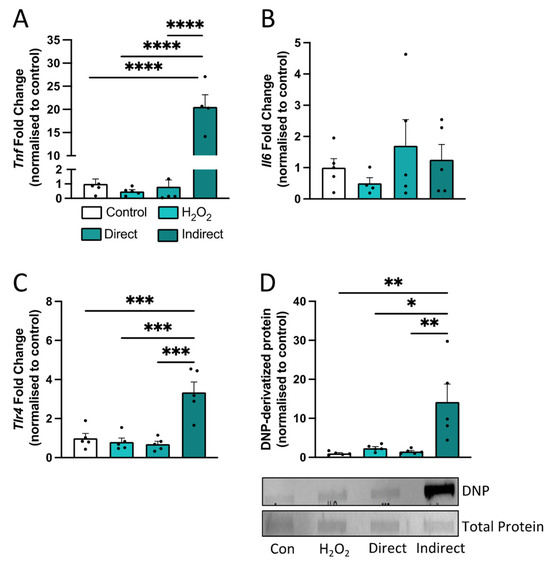 Indirect cigarette smoke extract (CSE) conditioned medium evoked a pro-inflammatory and oxidative stress response in human microglial cells (HMC-3). Lung epithelial cells (BEAS-2B) were exposed to cigarette smoke extract (CSE [25%]) for 6 h (indirect), and culture medium was transferred onto HMC-3 cells and incubated for 24 h (n = 6 per group). HMC-3 cells were also either exposed to 10% CSE (direct) or hydrogen peroxide (H2O2) for 24 h (n = 6 per group). (A–C) Gene expression of inflammatory markers in HMC-3 cells, including (A) tumor necrosis factor-alpha (Tnfα), (B) interleukin-6 (Il6), and (C) toll-like receptor 4 (Tlr4). (D) DNP-derivatized protein in HMC-3 cells. Data are expressed as mean + SEM. * p < 0.05, ** p < 0.01, *** p < 0.001, **** p < 0.0001.
