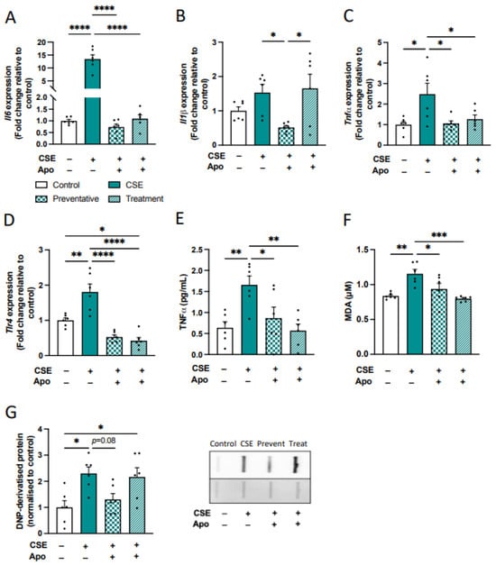 Treatment with apocynin prevented cigarette smoke extract (CSE)-induced inflammation and oxidative stress in human microglial cells (HMC-3). HMC3 cells were treated with CSE-indirect condition medium derived from BEAS-2B cells treated with apocynin (500 nM) as co-administration (preventative) or therapeutic for 24 h. (A–D) Gene expression of inflammatory markers in HMC-3 cells. (A) interleukin 6 (Il6). (B) Il1β. (C) tumor necrosis factor-alpha (Tnfα). (D) Toll-like receptor 4 (Tlr4; n = 6 per group). (E) TNF cytokine and(F) MDA levels in the supernatant measured by ELISA and the TBARS assay kit, respectively (n = 6 per group). (G) DNP-derivatized protein in HMC-3 cells. Data are expressed as mean + SEM. * p < 0.05, ** p < 0.01, *** p < 0.001, **** p < 0.0001.