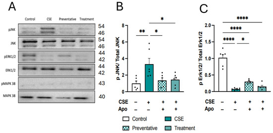 Apocynin altered the expression of mitogen-activated protein kinases (MAPK) signaling pathways in HMC-3 cells following exposure to cigarette smoke extract conditioned media from BEAS-2B cells. (A) Representative image of protein expression of phosphorylated and total c-Jun N-terminal kinase (JNK), extracellular signal-regulated kinase (ERK1/2), and p38 in HMC3 cells. (B) Phospho-JNK; (C) Phospho-ERK1/2, (n = 6 per group). Data are expressed as mean + SEM. * p < 0.05, ** p < 0.01, **** p < 0.0001.
