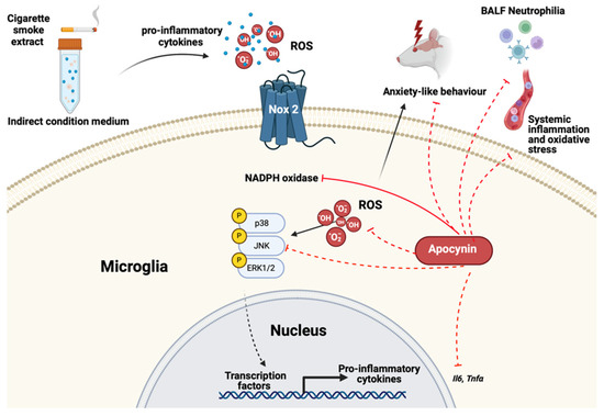 One potential mechanism of CS-induced neurocognitive dysfunction in COPD is microglial-mediated neuroinflammation [43,44,45]. Microglia are the resident immune cells of the central nervous system (CNS) and actively regulate functions within the brain parenchyma, both in healthy and disease states [46]. Microglia are dynamic cells with highly motile processes that interact not only with the neurons [47], but also with other glial cells [48] and the vascular system [49]. In the physiological state, microglia extend their processes to actively survey the surrounding microenvironment, playing a crucial role in modulating and supporting neurogenesis by phagocytosing apoptotic cells, regulating neurogenesis levels influenced by inflammation and environmental enrichment, and actively modifying synaptic connections at the dendritic and synaptic levels in response to neuronal activity [12,50,51]. Upon stimulation, such as during injury or repair, microglia undergo morphological changes and secrete pro-inflammatory cytokines and oxidative stress mediators [12,50,51]. When this pro-inflammatory profile is uncontrolled or chronic, it results in impaired microglial function, which not only leads to excessive production of inflammatory and oxidative stress mediators but also induces altered modulation of neuronal activity, thereby driving impairments in neurocognition [12,51,52]. We have previously shown that exposure to CS for at least 8 weeks causes impairments in recognition memory and social recognition memory associated with altered microglial profiles within both the hippocampus and hypothalamus [3,12,53]. However, there are limited studies investigating the anxiety-like behavior in COPD and the underlying mechanisms responsible for this comorbidity. Thus, we aimed to investigate whether CS exposure induces an anxiety-like phenotype similar to humans with COPD and whether this is associated with altered neuroinflammatory profiles within key brain regions associated with anxiety. We also evaluated whether targeting the pro-inflammatory and oxidative stress profiles with apocynin, a NOX2 inhibitor [54,55], could prevent the CS-induced anxiety-like behavior and neuroinflammatory profiles.