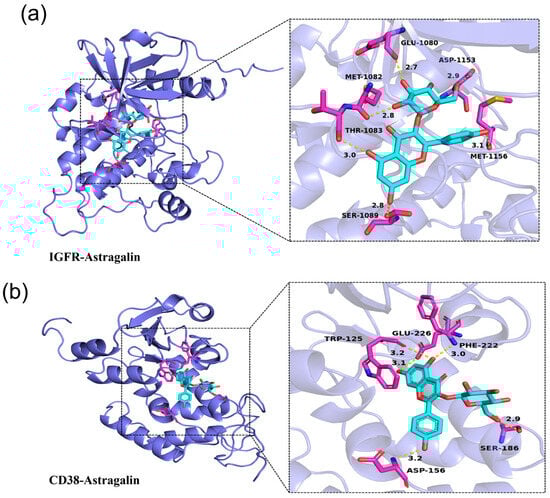 Molecular docking of IGFR/CD38 with AG: (a) docking of AG with IGFR; (b) docking of AG with CD38.