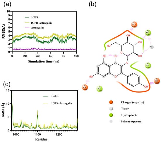 Molecular dynamics simulations of IGFR with AG: (a) RMSD of AG-IGFR; (b) two-dimensional protein–ligand interaction diagram between AG and IGFR; and (c) RMSF of AG-IGFR.