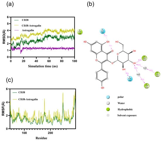 Molecular dynamics simulations of CD38 with AG: (a) RMSD of AG-CD38; (b) two-dimensional protein–ligand interaction diagram between AG and CD38; and (c) RMSF of AG-CD38.
