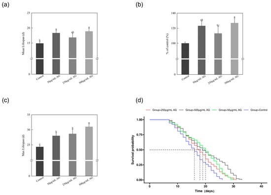 AG extended the lifespan of C. elegans: (a) effect of AG on the mean lifespan of N2 wild-type C. elegans; (b) effect of AG on the life extension rate of N2 wild-type C. elegans; (c) effect of AG on the survival curve of N2 wild-type C. elegans; (c) effect of AG on the max lifespan of N2 wild-type C. elegans; and (d) effect of AG on the survival curve of N2 wild-type C. elegans. The experiment was repeated at least three times. Notes: No common letter in the same treatment group indicates a significant difference (p < 0.05).