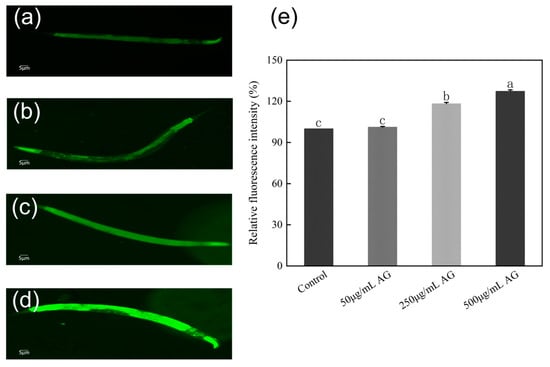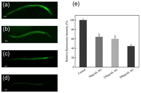 AG reduces ROS levels of C. elegans: (a) ROS levels of C. elegans treated without AG; (b) ROS levels of C. elegans treated with 50 µg/mL AG; (c) ROS levels of C. elegans treated with 250 µg/mL AG; (d) ROS levels of C. elegans treated with 500 µg/mL AG; and (e) effect of AG on the ROS of C. elegans. The experiment was repeated at least three times. In the absence of a common letter within the same treatment group, this indicates a significant difference (p < 0.05).