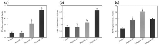 In addition, 500 µg/mL of AG significantly up-regulated the expression of daf-16, skn-1, and sod-3 (p < 0.05), which is consistent with the results of the SOD levels assay. However, AG had almost no effect on sod-5 expression. Notably, the regulation of skn-1 is usually dependent on the MAPK pathway. The examination was conducted on the expression of two crucial transcription factors, sek-1 and tir-1, within the MAPK pathway (Figure 9). The results revealed a significant increase in the expression levels of both factors when the concentration of AG reached or exceeded 250 µg/mL (p < 0.05).