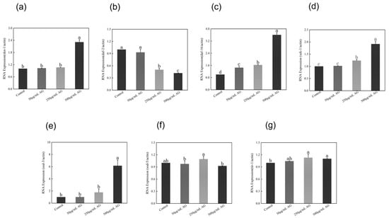 AG regulates the IIS pathway and AMPK-associated mRNA expression in C. elegans: (a) effect of AG on skn-1 expressions in C. elegans; (b) effect of AG on daf-2 expressions in C. elegans; (c) effect of AG on daf-16 expressions in C. elegans; (d) effect of AG on sek-1 expressions in C. elegans; (e) effect of AG on sod-3 expressions in C. elegans; (f) effect of AG on sod-5 expressions in C. elegans; and (g) effect of AG on tir-1 expressions in C. elegans. The experiment was repeated at least three times. Note: No common letter in the same treatment group indicates a significant difference (p < 0.05).