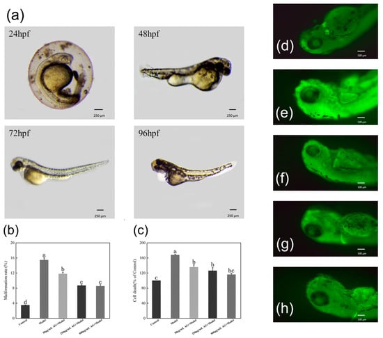 AG inhibits H2O2-induced malformation rate and cell death in zebrafish embryos: (a) H2O2 -induced damage in zebrafish embryos; (b) effect of AG on the malformation rate of zebrafish embryos; (c) effect of AG on the rate of cellular mortality in zebrafish embryos; (d) cell death of zebrafish embryos without AG and H2O2; (e) cell death of zebrafish embryos with H2O2; (f) cell death of zebrafish embryos with 50 µg/mL AG; (g) cell death of zebrafish embryos with 250 µg/mL AG; and (h) cell death of zebrafish embryos with 500 µg/mL AG. The experiment was repeated at least three times. Note: No common letter in the same treatment group indicates a significant difference (p < 0.05).