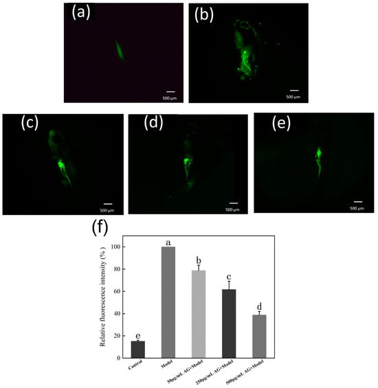 AG reduces ROS levels of zebrafish embryos: (a) ROS of zebrafish embryos without AG and H2O2; (b) ROS of zebrafish embryos with H2O2; (c) ROS of zebrafish embryos with 50 µg/mL AG; (d) ROS of zebrafish embryos with 250 µg/mL AG; (e) ROS of zebrafish embryos with 500 µg/mL AG; and (f) effect of AG on the ROS of zebrafish embryos. The experiment was repeated at least three times. Note: No common letter in the same treatment group indicates a significant difference (p < 0.05).