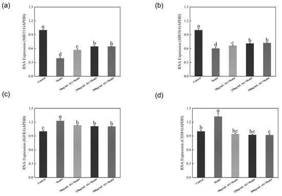 AG regulates Sirtuins-associated mRNA expression in zebrafish embryos: (a) effect of AG on SIRT1 expressions in zebrafish embryos; (b) effect of AG on SIRT6 expressions in zebrafish embryos; (c) effect of AG on IGFR expressions in zebrafish embryos; and (d) effect of AG on CD38 expressions in zebrafish embryos. The experiment was repeated at least three times. Note: No common letter in the same treatment group indicates a significant difference (p < 0.05).