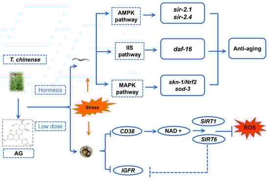 The schematic mechanism of action of AG as hormesis nutrition in anti-aging and antioxidant process: The figure represents hormesis and nutrients (AG) and the involvement of skn-1/Nrf2, daf-16, sod-3, SIRT1, and SIRT6 genes to enhance antioxidant activity and stresses resistance and the inhibition of IGFR/daf-2 and CD38 genes via the activation of AMPK/ MAPK/IIS pathway in order to regulate the lifespan of C. elegans and the antioxidant capacity of zebrafish embryos by inducing anti-aging and antioxidant effects dose dependently [70].