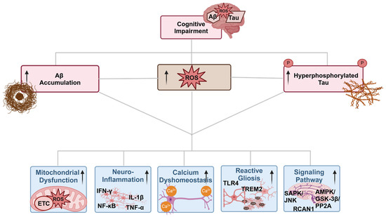 Cognitive impairment due to accumulation of Aβ plaques, phosphorylated tau protein, and ROS, along with their interplay. Aβ, ROS, and phosphorylated tau, in turn, interact in ways that involve mitochondrial dysfunction, neuroinflammation, calcium dyshomeostasis, reactive gliosis, and dysregulation of various signaling pathways in neuroinflammation-induced AD.