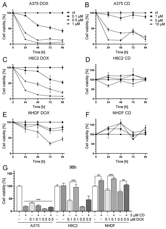 Effect of DOX and CD on the cell viability of A375 human melanoma cells, H9C2 rat cardiac myoblasts and normal human dermal fibroblasts (NHDF). (A–F): A375 (A,B), H9C2 (C,D) and NHDF (E,F) were treated with increasing concentrations of DOX (A,C,E) and CD (B,D,F) for 24, 48, 72 and 96 h. (G) For comparing A375, H9C2 and NHDF, cells were treated with different concentrations of DOX alone or in combination with CD for 96 h. Cell viability was determined via the MTT assay and mock-treated control (ct) was set to 100%. Data represent means ± SEM, n ≥ 3. (G) One-way ANOVA was used to determine statistical significance in A375 cells compared to control (white bar). Two-way ANOVA was used in H9C2 and NHDF to compare CD-untreated (0 µM) with CD-treated cells (5 µM). ** p ≤ 0.01, *** p ≤ 0.001.