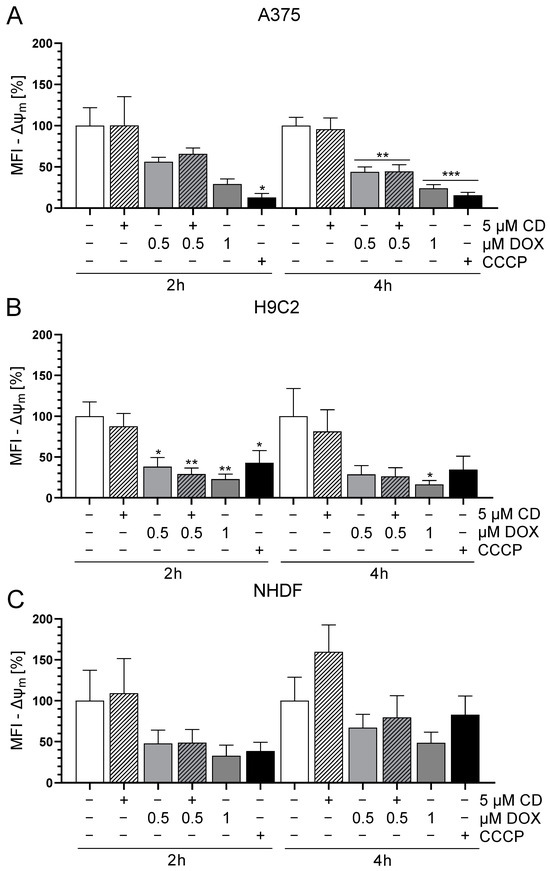 The treatment with CD had no effect on the Δψm in any of the cell lines, whereas DOX decreased the Δψm in all cell lines (Figure 2). In the case of A375 cells, the DOX-induced decrease in Δψm was time-dependent and was stronger and more significant after 4 h compared to 2 h (Figure 2A). This effect was converse in the normal (healthy) cell line NHDF, where 2 h DOX treatment showed a higher impact compared to 4 h (Figure 2C). As for H9C2 cells, there was a significant drop in Δψm after all DOX concentrations after 2 h. In case of the 4 h treatment, only 1 µM DOX showed a significant effect but all DOX concentrations seemed to have an impact on the Δψm (Figure 2B). When comparing all cell types, H9C2 was the most sensitive and resulted in the highest decrease in Δψm after DOX treatment. Furthermore, there was no difference between the treatment with DOX alone or in combination with CD. Therefore, a change in the Δψm was most probably not involved in the protective effect of CD seen in normal (healthy) cells, whereas it could have had an impact on the DOX-induced cytotoxicity seen in all cell lines.