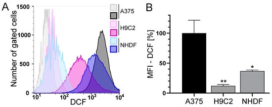 The basal ROS level in A375, H9C2 and NHDF. (A,B): A375, H9C2 and NHDF were treated with 0.1 µM H2DCF-DA and the level of DCF as a measure of intracellular ROS was determined by flow cytometry using a CyFlow Cube 6. FlowJo software was used to create a histogram overlay (A) and to calculate the MFI (B). (A) Representative histograms for treatment with H2DCF-DA (dark histograms) were depicted, and unstained cells served as the negative control (light histograms). Fluorescence intensity is plotted against the cell number. (B) The MFI of the cells treated with H2DCF-DA is depicted. The MFI of unstained cells served as the negative control and the MFI of A375 cells was set to 100%. Data represent means ± SEM, n ≥ 3. A one-way ANOVA was used to determine statistical significance compared to the control. * p ≤ 0.05, ** p ≤ 0.01.