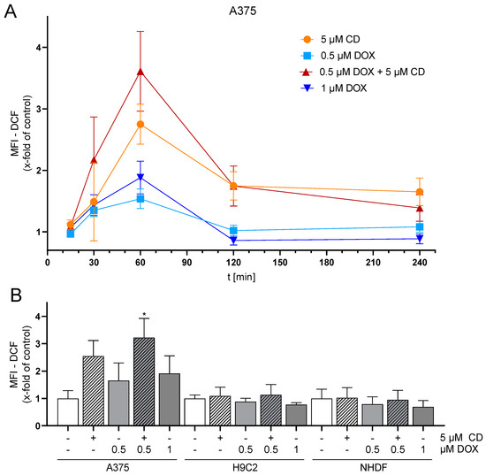 Effect of DOX and CD on ROS production in A375, H9C2 and NHDF. (A) A375 cells were preincubated with H2DCF-DA (20 µM, 20 min) and treated with DOX alone or in combination with 5 µM CD for 15 min–4 h. (B) For comparing A375, H9C2 and NHDF, cells were stained with H2DCF-DA (20 µM, 20 min) and treated with DOX alone or in combination with 5 µM CD for 1 h. Level of DCF was determined by flow cytometry using CyFlow Cube 6, and FlowJo software was used to calculate MFI. Mock-treated control was set to 1. Data represent means ± SEM, n ≥ 3. One-way ANOVA was used to determine statistical significance compared to respective control. * p ≤ 0.05.