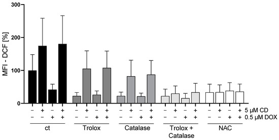 All antioxidants (trolox, catalase, and the combination or N-acetylcysteine (NAC) alone) showed the tendency to decrease the basal ROS level in A375 cells (ct, -CD, -DOX). When looking at the CD-induced ROS formation, trolox and catalase also slightly decreased the level of ROS, but only the combination of catalase and trolox or NAC alone lowered the ROS amount to the level of the cells treated only with antioxidants (-CD, -DOX).