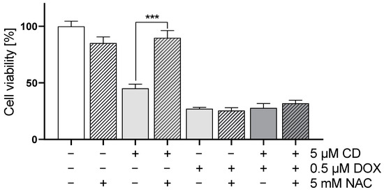 Effect of antioxidant NAC on DOX- and CD-modulated cell viability in A375 cells. A375 cells were treated with 5 mM NAC for 4 h, followed by treatment with DOX alone or in combination with 5 µM CD for 24 h. Cell viability was determined via MTT assay and mock-treated control (ct) was set to 100%. Data represent means ± SEM, n = 4. Two-way ANOVA was used to determine statistical significance between NAC-untreated and -treated conditions. *** p ≤ 0.001.