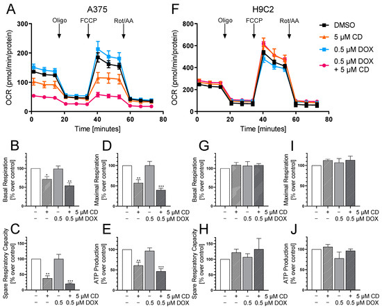 The effect of DOX and CD on mitochondrial respiration in A375 and H9C2 cells. (A–J): A375 and H9C2 cells were treated with 5 µM CD for 24 h with or without the addition of different concentrations of DOX for the last 4 h. After successive injection of oligomycin (Oligo), FCCP and rotenone/antimycin A (Rot/AA), the oxygen consumption rate (OCR) was measured using a Seahorse XF Analyzer. (A,F) A representative curve is depicted for A375 (A) and H9C2 cells (F). (B–E,G–J) Based on the OCR in response to the mitochondrial stressors, the parameters “Basal Respiration” (B,G), “Spare Respiratory Capacity” (C,H), “Maximal Respiration” (D,I) and “ATP Production” (E,J) were calculated for A375 (B–E) and H9C2 cells (G–J). The mock-treated control (DMSO) was set to 100%. The data represent means ± SEM, n ≥ 3. One-way ANOVA was used to determine statistical significance compared to the respective control. * p ≤ 0.05, ** p ≤ 0.01, *** p ≤ 0.001.