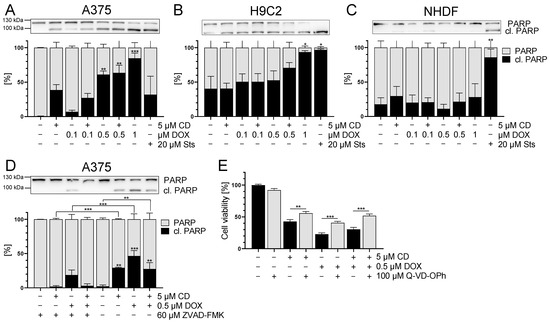 The effect of DOX and CD on apoptosis in A375, H9C2 and NHDF. (A–C): PARP cleavage (in black) after treatment with DOX alone or in combination with 5 µM CD for 24 h in A375 (A), H9C2 (B) and NHDF (C). Staurosporine (Sts, 20 μM) served as the positive control. (D,E): A375 cells were treated with the pan caspase inhibitors Z-VAD-FMK (D) or Q-VD-OPh (E) for 4 h, followed by treatment with DOX and CD alone or in combination for further 24 h. (A–D) Western blot analysis of PARP cleavage. Densitometric analysis of the Western blots was performed using FusionCapt Advance software and the total amount of PARP and cleaved PARP was set to 100%. Representative blots and the respective quantifications are depicted. (E) Cell viability was determined with the MTT assay and the optical density (OD) of the mock-treated control was set to 100%. The data represent means ± SEM, n = 3. One-way ANOVA was used to determine statistical significance compared to the control (A–C). Two-way ANOVA was used to determine the statistical significance between the Z-VAD-FMK- or Q-VD-OPh-untreated and -treated conditions (D,E). * p ≤ 0.05, ** p ≤ 0.01, *** p ≤ 0.001.