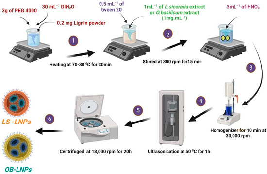 LS-LNPs and OB-LNPs were prepared as previously described [37], with some modifications. As presented in Figure 1, lignin (0.2 mg) (Green Value S.A, Orbe, Switzerland) was dissolved in 30 mL of polyethylene glycol 4000 (PEG) (Oxoid, Hampshire, UK), 0.5 mL of tween 20 (Merck, Darmstadt, Germany) was added, and the mixture was stirred at 300 rpm for 15 min at 50 °C to preactivate lignin. Then 1 mL of L. siceraria seed oil and O. basilicum ethanolic extract at a final concentration of 1 mg/mL was added. After that, 3 mL of nitric acid (HNO3) (Oxoid, Hampshire, UK) was added drop by drop, and the solution was subjected to homogenizer (Heidolph, DIAX 900, Schwbach, Germany) for 10 min at 30,000 rpm, then ultrasound (20 kHZ, 50% amplitude, Ti horn) for 1 h at 50 °C to produce LS-LNPs and OB-LNPs (VCX 750 ultrasonic processor, Sonics & Materials, Inc., Newtown, CT, USA). The mixture was centrifuged at 18,000 rpm for 20 min to remove unreacted molecules in the supernatant. The pellet was resuspended in distilled water and concentrated five times, and the particles were disaggregated by applying a low-intensity ultrasound. Finally, the NPs were centrifuged at 500× g for 10 min to remove larger aggregates. The LS-LNPs and OB-LNPs were stored at 4 °C. Preactivation of bulk lignin nanoparticles (LNPs) without L. siceraria and O. basilicum was carried out as described above. Transmission electron microscopy (TEM) and selected area electron diffraction (SAED) were used to study the morphology and distribution of the NPs by placing 10 μL of diluted sample onto holey carbon films on copper grids [38]. The samples were observed using a JEOL JEM-2100 LaB6 microscope (JEOL Ltd., Tokyo, Japan) operating at an accelerating voltage of 200 kV. The UV-vis spectra were obtained using a GENESYS™ G10S spectrophotometer (Thermo Fisher Scientific, Waltham, MA, USA). The absorbance of the solutions was measured in the range of 200–800 nm. The Zeta potential of the particles was determined using a Zetasizer Nano ZS™ ZEN3600 (Malvern Instruments Ltd., Malvern, UK). Carl Zeiss Microscopy (GmbH, Rudolf Eber Str. Oberkochen, Germany) was used for obtaining X-ray diffractograms (XRD) of the nanoparticles. A Fourier transform infrared (FTIR) spectrometer (JASCO FT-IR 4100 spectrometer, Hachioji, Tokyo, Japan) was used for obtaining the FTIR spectra over a range of 4000–500 cm−1.