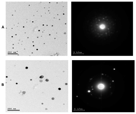 TEM micrographs and selected area electron diffraction (SAED) patterns of LS-LNPs (A) and OB-LNPs (B) showing nano sphere shape with concentric rings of brilliant spots.