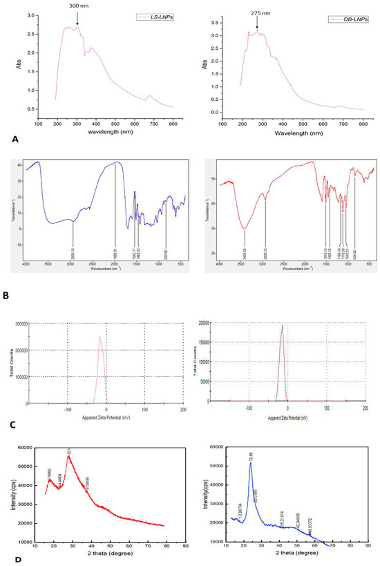 UV-visible spectra (A), FT-IR spectra (B), zeta potential (C), and XRD patterns (D) of LS-LNPs and OB-LNPs.