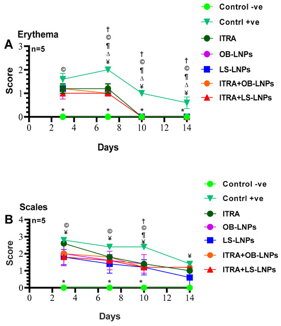 Means of erythema (A), scales (B), and alopecia (C) scores in Trichophyton rubrum infected guinea pigs in different groups. Symbols on the graphs indicate significant differences among the treated groups (itraconazole (ITRA), ITRA+LC-LNPs, ITRA+OB-LNPs, OB-LNPs, and LS-LNPs) and the untreated positive control group (p < 0.05). p-value was estimated using Exact Wilcoxon test.