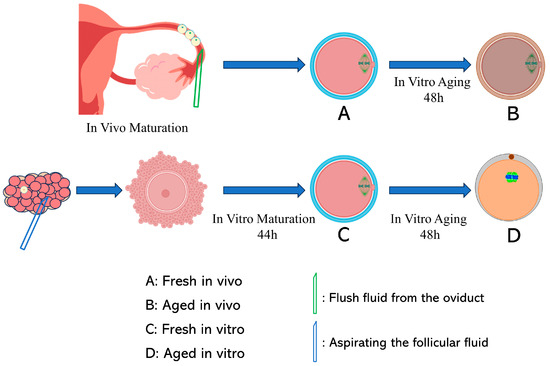 In vitro fresh and aged oocytes were collected as described previously [22,23]. CCs were removed with 1 mg/mL hyaluronidase by pipetting approximately 40 times after IVM. MII stage oocytes were selected for further studies. To analyze oocyte POA, the selected MII stage oocytes were continuously cultured in an IVM medium covered with mineral oil for an additional 48 h.