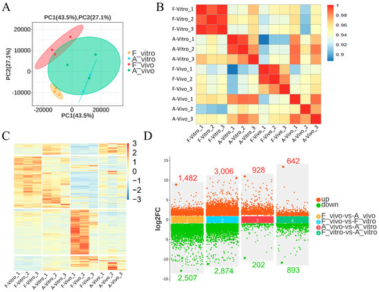 Principal component analysis showed that oocytes from the four groups were in different sets (PC1: 43.5%, PC2: 27.1%). The four groups showed significant differentiation and good reproducibility (Figure 2A). The Spearman correlation heatmap showed good intra-group reproducibility and the four groups were clearly distinguished from each other (Figure 2B). The heat map (Figure 2C) shows overall gene expression patterns across four groups. These results indicate that different cultural environments had a profound influence on the quality and anti-aging abilities of porcine oocytes. As shown in Figure 2D, 3989 genes (1482 up and 2507 down) were differentially expressed between the F_vivo and A_vivo, 5880 genes (3006 up and 2874 down) were differentially expressed between the F_vivo and F_vitro, 1130 genes (928 up and 202 down) were differentially expressed between the A_vivo and A_vitro, and 1535 genes (642 up and 893 down) were differentially expressed between the F_vitro and A_vitro (Table S5).