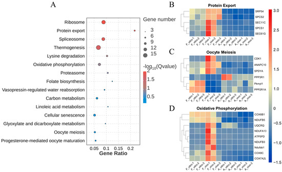 KEGG enrichment analysis of common DEGs caused by POA in both in vivo- and vitro-matured oocytes. (A) KEGG enrichment analysis on common DEGs showing the top 15 enriched KEGG pathways. (B) The heat map for gene expression levels associated with protein export in enriched KEGG pathway. (C) The heat map for gene expression levels associated with oocyte meiosis in enriched KEGG pathway. (D) The heat map for gene expression levels associated with oxidative phosphorylation in enriched KEGG pathway.