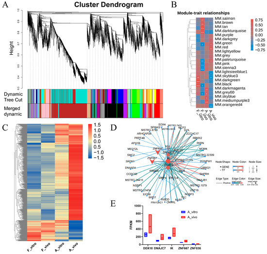 The gene regulatory relationship network diagram was used to obtain the core genes at the hub position in the regulatory relationship network within the red module (Figure 5D). DnaJ heat shock protein family (Hsp40) member C7 (DNAJC7), IK cytokine (IK), DEAD-Box Helicase 18 (DDX18) and transcription factors zinc finger proteins 836 (ZNF836), and ZNF667 were at the hub position. The expression patterns of these five genes are shown in Figure 5E. All five genes have higher expression levels in the A_vivo than in the A_vitro group.