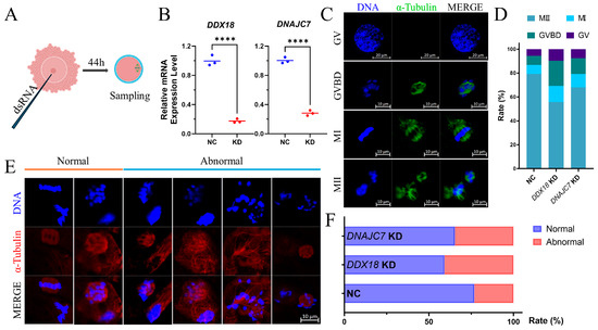 Effects of DDX18 and DNAJC7 knockdown on oocyte maturation. (A) Knockdown of DDX18 and DNAJC7 expression by injecting dsRNA into GV stage COCs. (B) Relative mRNA expression levels of DDX18 and DNAJC7 at MII stage oocytes. (C) Representative images of α-Tubulin morphology in GV, GVBD, MI, and MII stages. Bar = 10 μL and 20 μL in the GV line. (D) The proportion of oocytes at each stage after DDX18 and DNAJC7 knockdown. (E) Representative images of normal and abnormal α-Tubulin morphology in MII stage oocytes. Bar = 10 μL. (F) The proportion of normal and abnormal α-Tubulin morphology in NC, DDX18 KD, and DNAJC7 KD group MII stage oocytes. **** means p-value < 0.0001.