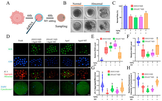 To further determine the role of DDX18 and DNAJC7 during the POA process, the expression of DDX18 and DNAJC7 was knocked down by injecting the dsRNA into the MII stage oocytes. At the same time, melatonin, an antioxidant that has been widely proven to reduce oxidative stress in porcine oocytes [27,28], was added to the extended 48-h IVM (Figure 7A). During the POA process, MII stage oocytes will exhibit abnormal phenotypes such as cytoplasmic fragmentation, second polar body exclusion, cleavage, and unclear cell membrane boundaries (Figure 7B). The addition of melatonin significantly increased the proportion of normal oocytes after POA, but the knockdown of DDX18 and DNAJC7 rendered melatonin ineffective (Figure 7C). Next, the changes in intracellular ROS, GSH, mitochondrial membrane potential, and cytochrome c were detected to measure the level of oxidative stress and mitochondrial function (Figure 7D). Intracellular ROS levels increased significantly after POA, and the supplementation of melatonin was able significantly to reduce ROS, while the knockdown of DDX18 and DNAJC7 reduced the ROS scavenging effect of melatonin (Figure 7E). Similar results were also shown in the changes in GSH content. The intracellular GSH level was significantly reduced after POA, and melatonin increased the GSH content. Knockdown of DDX18 and DNAJC7 reduced GSH content (Figure 7F). In terms of mitochondrial function, mitochondrial membrane potential was reduced by POA, and melatonin increased it. This rescue effect was also offset by the knockdown of DDX18 and DNAJC7 (Figure 7G). Cytochrome c was an essential component of the electron transport chain [29]. Its expression was significantly reduced after POA. The addition of melatonin increased its expression in senescent oocytes but was ineffective in senescent oocytes with the knockdown of DDX18 and DNAJC7. These results indicate that DDX18 and DNAJC7 were critical in oocyte resistance to oxidative stress and mitochondrial function damage caused by POA.