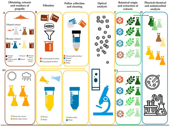 Figure 1. Flow chart of the various methods implemented in the analysis of honey and propolis samples. (A) Maceration of propolis, (A1) Honey samples, (B) extraction of pollen from propolis and honey (pollen analysis), (C) determination of the main vegetation species in propolis and maceration to obtain extracts, (C1) determination of the main vegetation species in honey and maceration to obtain extracts, (D) chemical and biological analysis of honey, propolis and vegetation of the main pollen types.