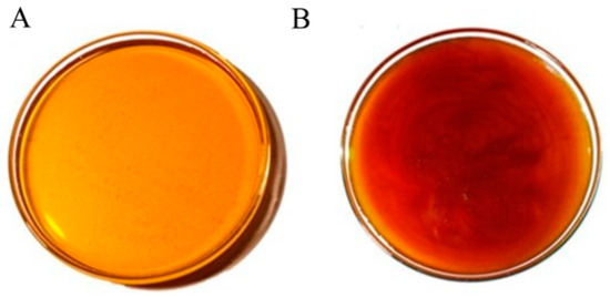 Figure 2. Changes in coloration between the honey collected at FES-C. (A) Collection in the dry season; (B) collection in the rainy season.
