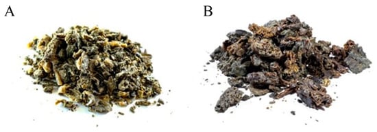 Figure 3. Physical characteristics of propolis collected during both the rainy and dry seasons. (A) Propolis collected in the dry season; (B) propolis collected in the rainy season.