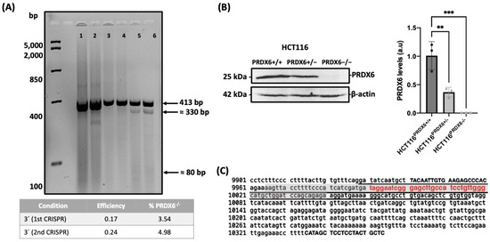 2.2. Construction of an HCT116 Cell Line without Peroxiredoxin 6 (HCT116PRDX6−/−) Using the CRISPR/Cas9 Methodology