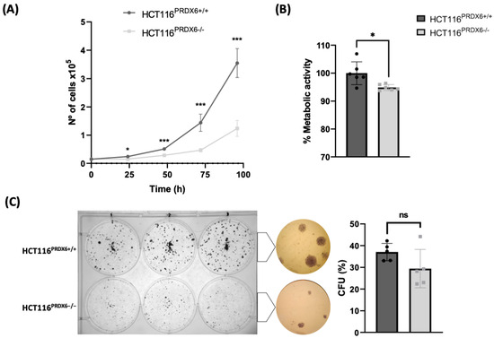 APA StyleLagal, D. J., Montes-Osuna, A. M., Ortiz-Olivencia, A., Arribas-Parejas, C., Ortiz-Alcántara, Á., Pescuezo-Castillo, C., Bárcena, J. A., Padilla, C. A., & Requejo-Aguilar, R. (2024). Tumoral Malignancy Decreases Coupled with Higher ROS and Lipid Peroxidation in HCT116 Colon Cancer Cells upon Loss of PRDX6. Antioxidants, 13(7), 881. https://doi.org/10.3390/antiox13070881