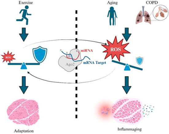 Previous studies have predominantly focused on how miRNAs affect muscle mass, with less attention being given to how miRNAs might alter antioxidant defense and redox balance, which may be closer to the root of muscle wasting in COPD and aging. The regulation of non-coding RNAs, particularly miRNAs, is crucial in muscle atrophy caused by aging and COPD [18]. In patients with COPD, the upregulation of miR-1, which modulates mTORC1 signaling, has been shown to be essential for muscle maintenance [19]. Borja-Gonzalez et al. [20] demonstrated a role of miR-181a in age-related muscle loss, marking miRNAs as key epigenetic regulators. In patients with COPD, miR-1, miR-133 and miR-206 were identified as crucial regulators of muscle phenotype and adaptation, with aging and nutritional abnormalities being significant factors [21]. Meanwhile, circulating levels of miR-21 and miR-206 have been demonstrated to be biomarkers for sarcopenia in respiratory diseases, including COPD [22], which may be extended to the aging context. The feasibility of miRNAs as therapeutic targets and biomarkers in aging-related skeletal muscle loss was also emphasized in a comprehensive review by Jung et al. [23]. Collectively, these findings underscore miRNAs’ critical role in muscle health and disease, presenting promising avenues for therapeutic interventions in COPD and age-related muscle disorders.
