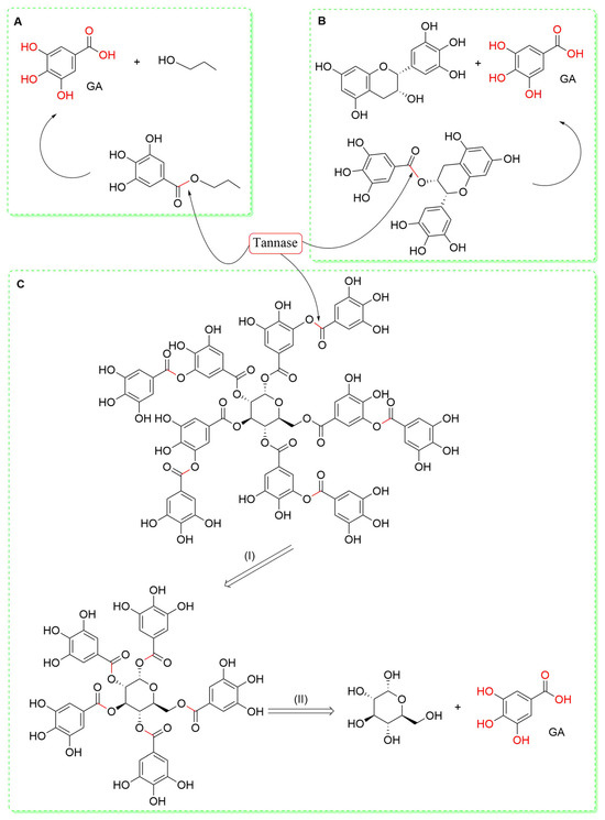 Production of GA from some of its derivatives by tannase-catalyzed reactions: propyl gallate (A), epigallocatechin gallate (B), and tannic acid (C).