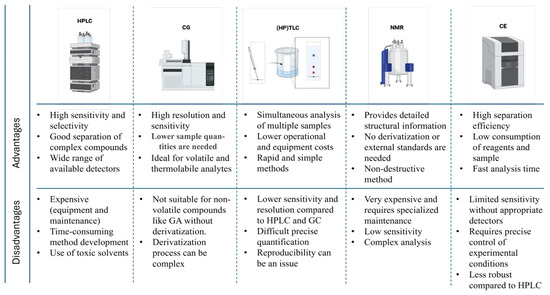 NMR spectroscopy is a method mainly used in the elucidation of molecular structures. 1H, 13C, or high-resolution magic-angle spinning (HR/MAS) NMR spectra can provide a wealth of chemical information on liquid and even semi-solid samples. In fact, NMR spectra of plant samples can act as fingerprints used to compare, discriminate between, or classify samples [98]. Yuan et al. [83] used 1H-NMR spectroscopy for the chemical characterization of commercial green teas. The authors identified and quantified the specific signals of GA and other phenolic compounds in the 1H-NMR spectrum, finding 0.34 to 1.88 mg/g GA in the different samples. In addition to GA (δ 7.14), they also identified (−)-epigallocatechin (δ 6.59), EGCG (δ 6.62), and caffeine (δ 7.68). On the other hand, Amargianitaki and Spyros [100] made an exhaustive summary of the research work related to the applications of NMR spectroscopy, focusing specifically on the use of two-dimensional nuclear magnetic resonance spectroscopy (2D NMR) to obtain the metabolic and/or non-volatile phenolic profile of port wines (Portugal). The studies reported the presence of several phenolic compounds, among them GA (δ 7.12). Although NMR has several advantages, such as the high structural elucidation power of the technique, it also has some drawbacks. The first (and most prohibitive) limitation is the high cost of the equipment. The second limiting reason is the relatively low sensitivity of NMR compared to other techniques such as HPLC or GS. Figure 3 shows the main advantages and disadvantages of each of the mentioned techniques, including NMR.